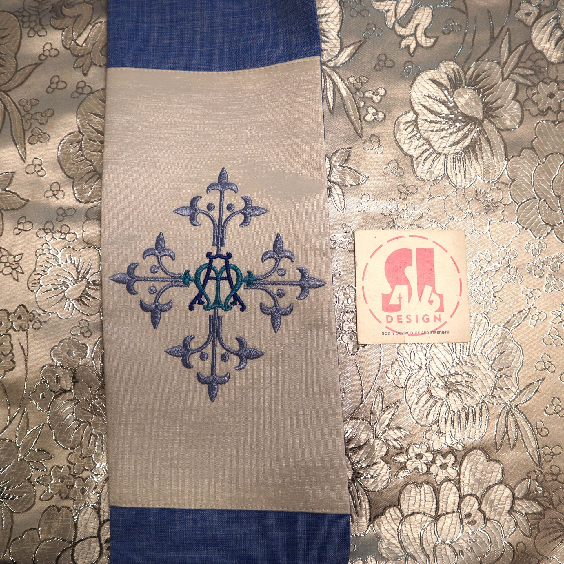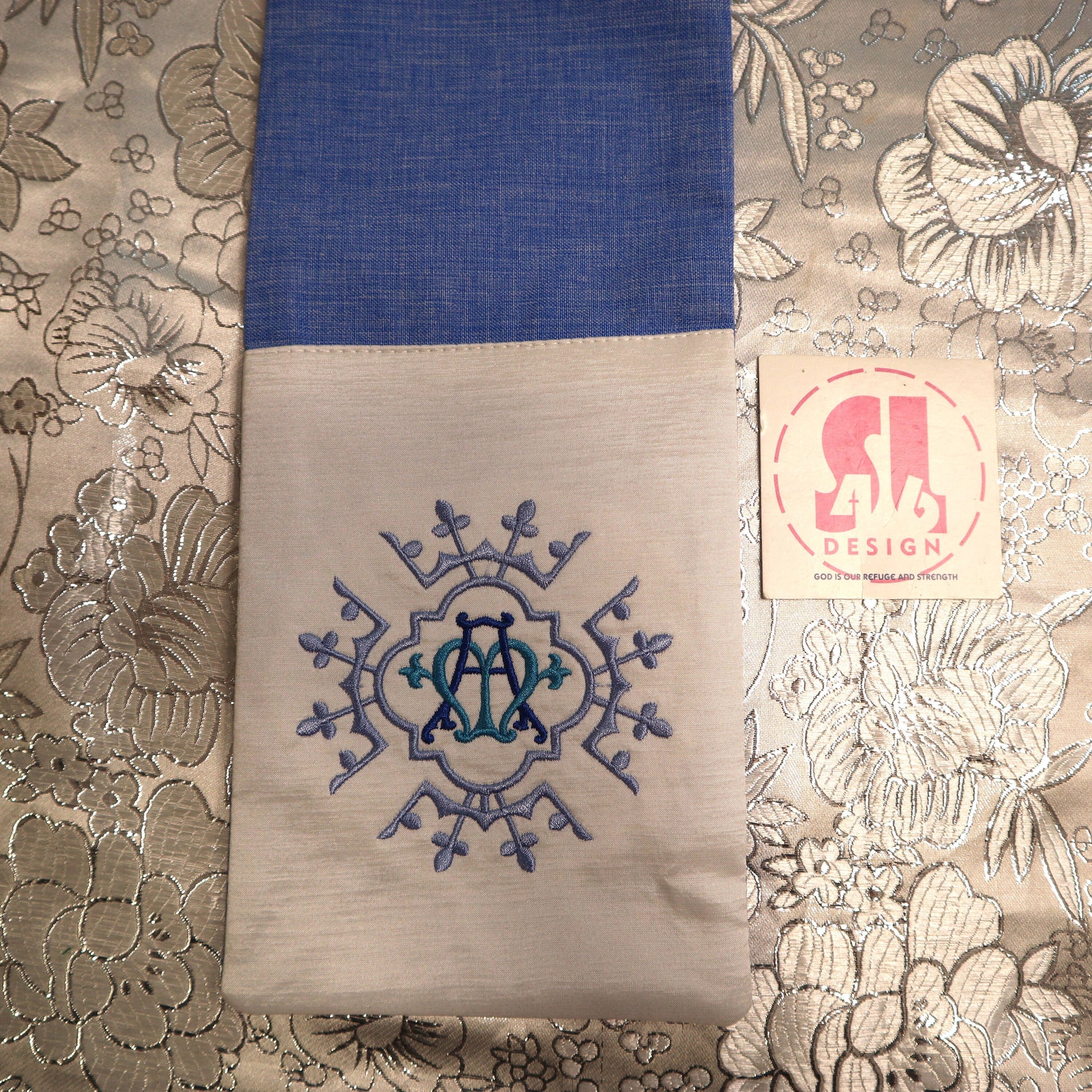 both embroidered designs are sitting on an accent brocade fabric for an elegant touch.