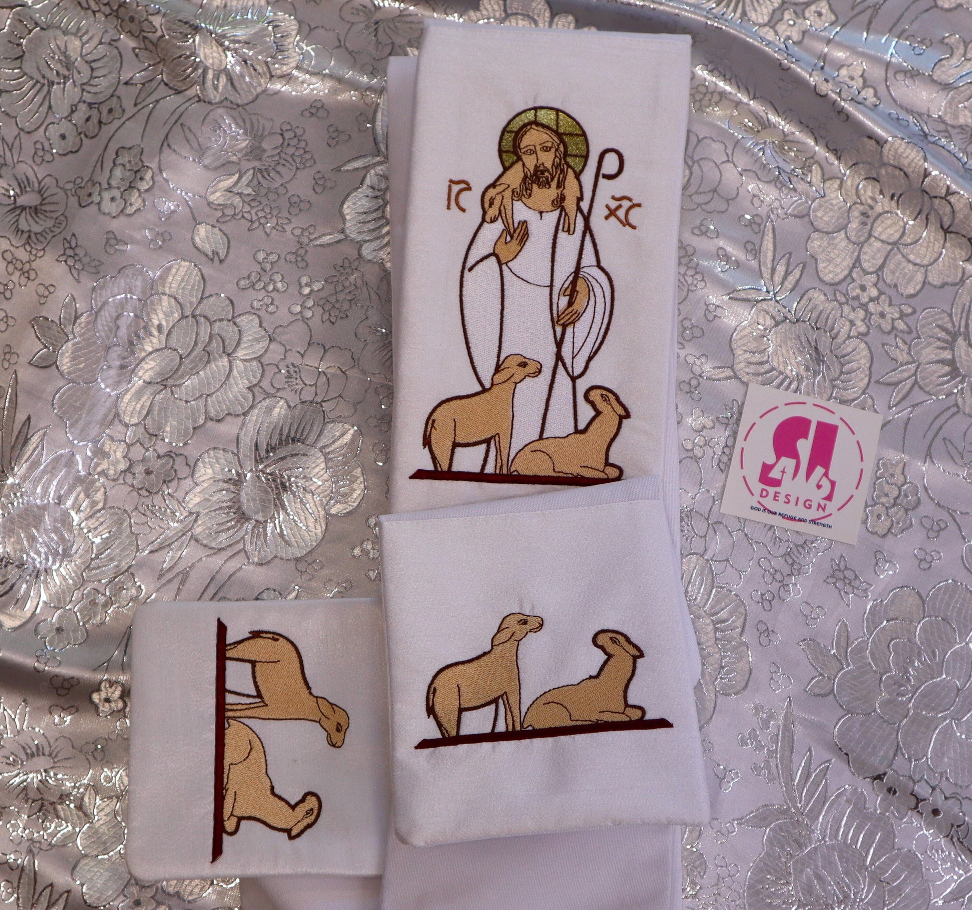both embroidered designs are sitting on an accent brocade fabric for an elegant touch.