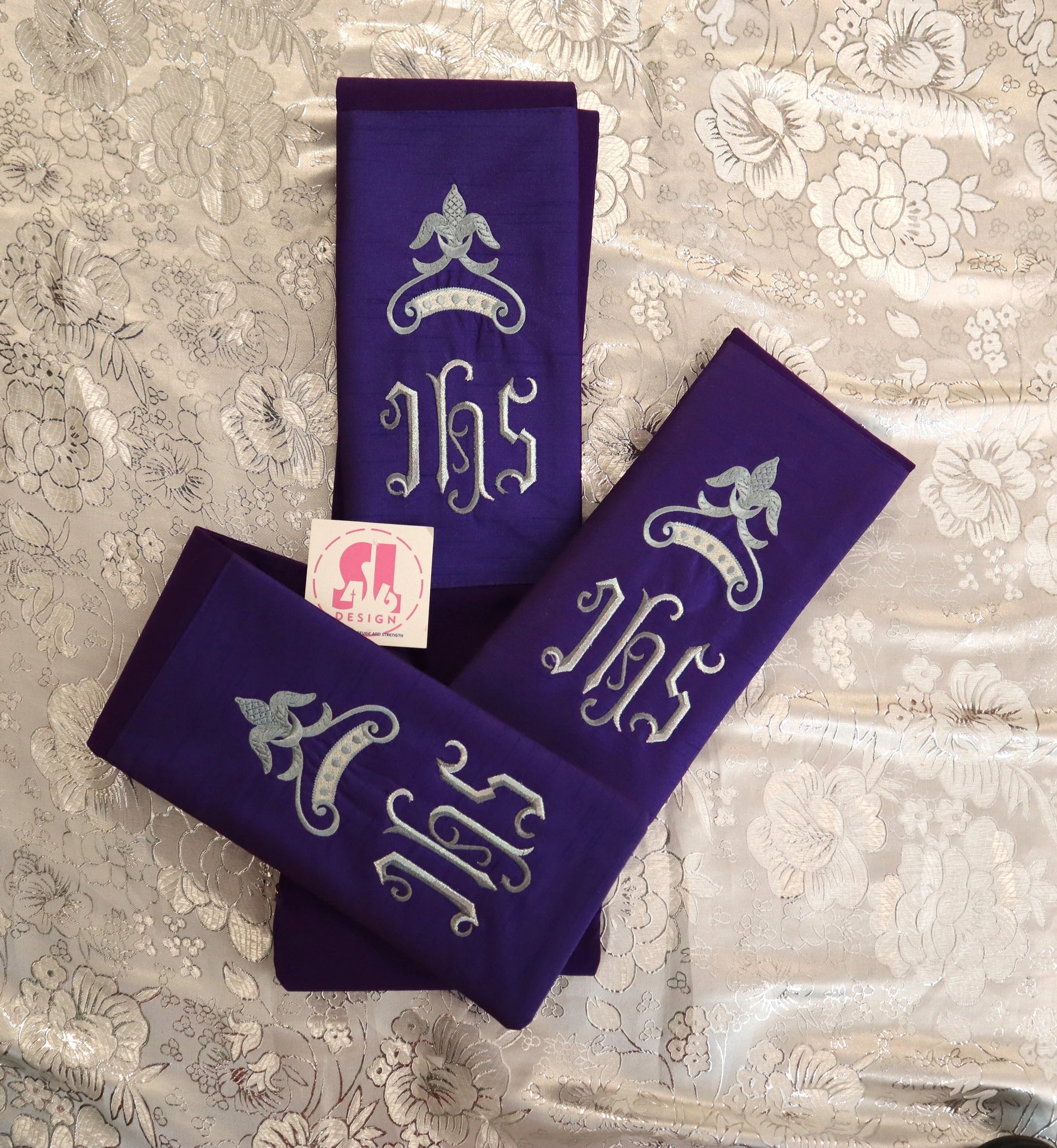 Materials: high quality cotton blend, the designs are embroidered in a accent fabric to give the piece an elegant touch, and the inside is a cotton blend that helps keep the stole in place.
