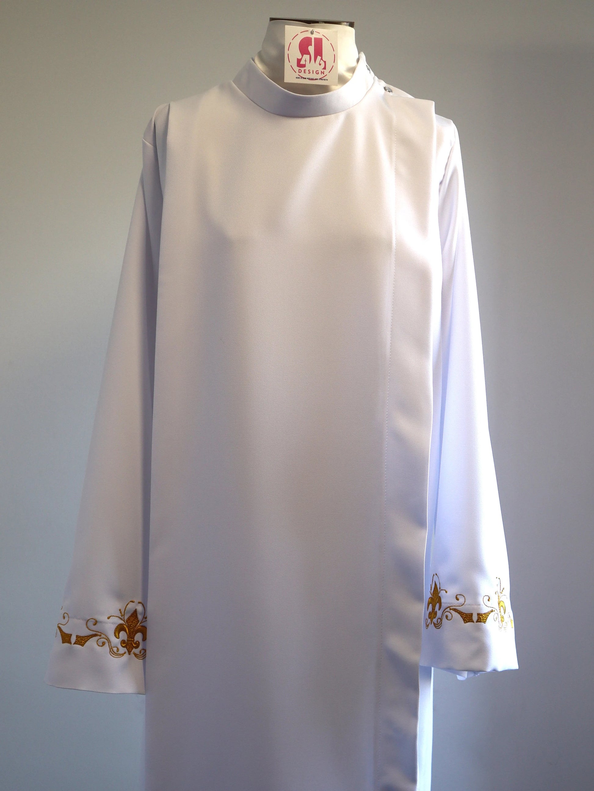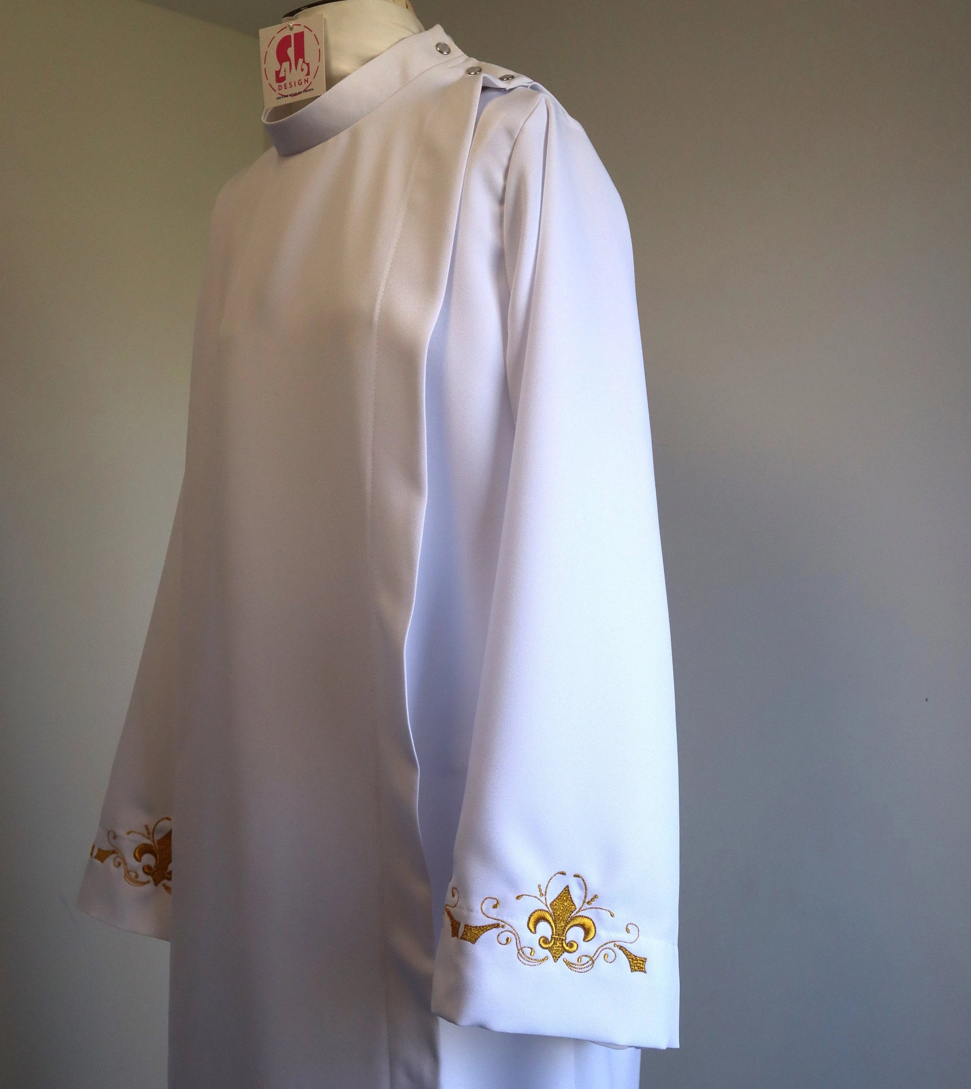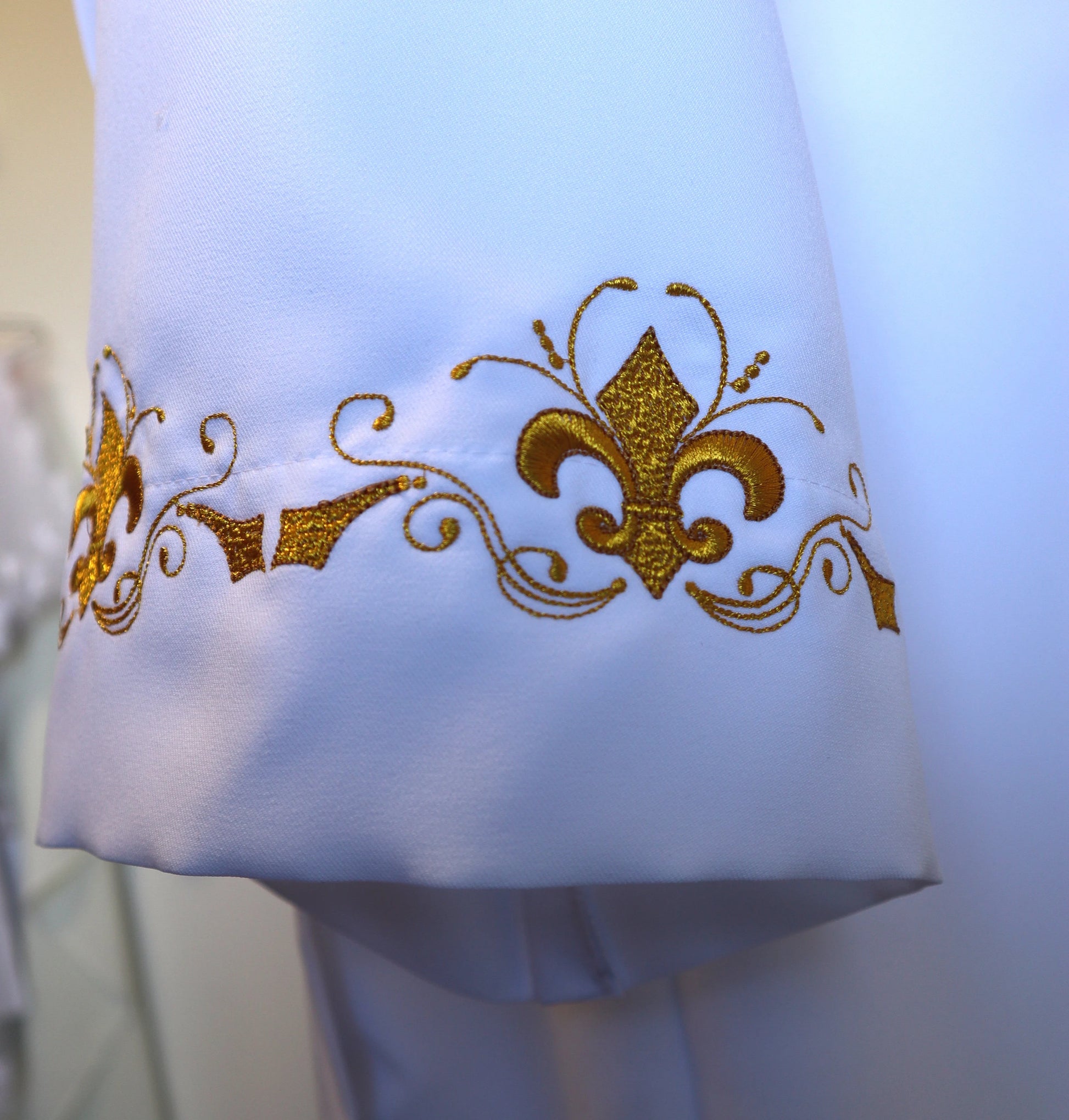 Custom made to fit. - there is embroidery designs on the front on the bottom front and back. And both sleeves. All embroidery are on white color to make them easy to wear all year long. But they can be changed if requested.
