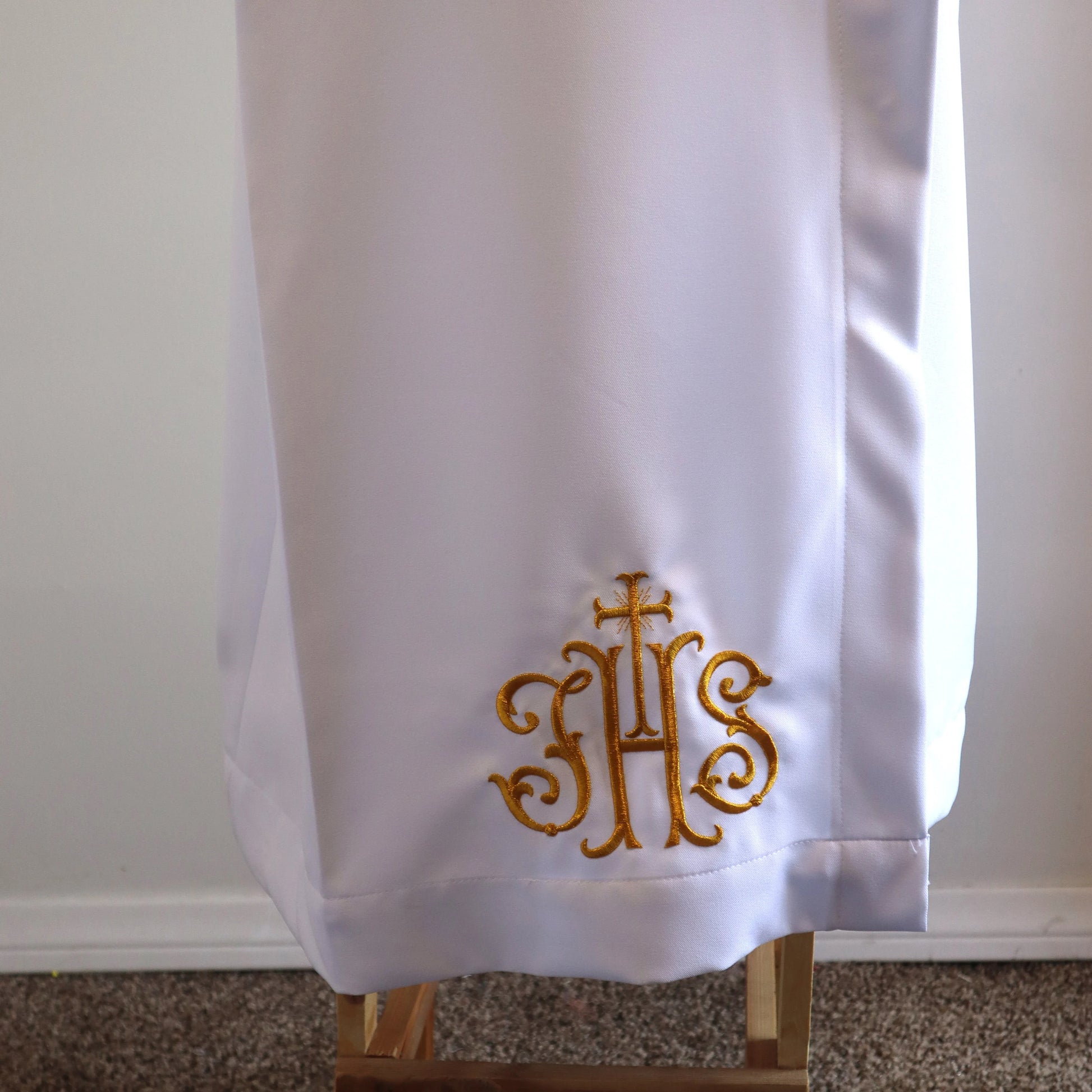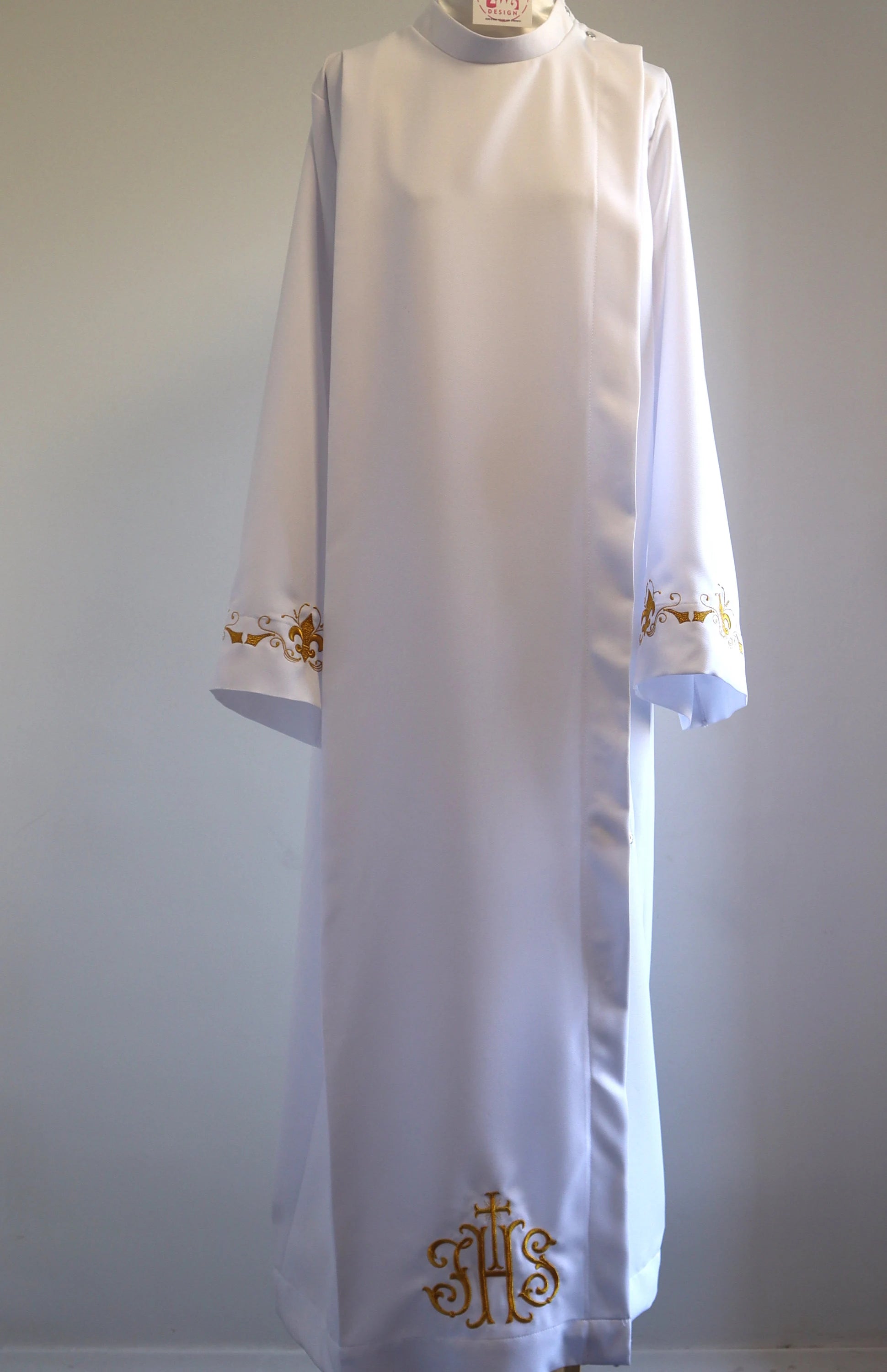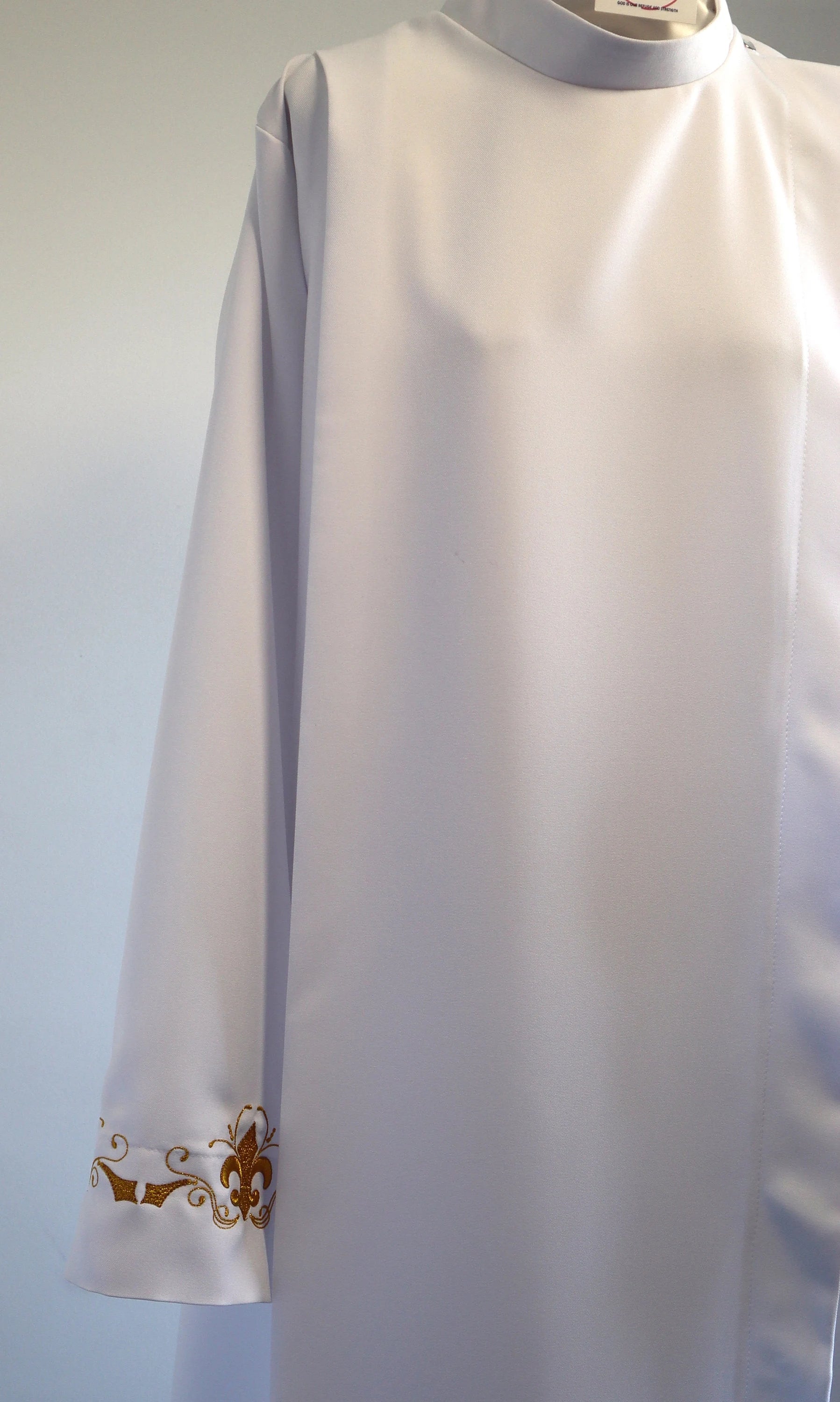 Custom made to fit. - there is embroidery designs on the front on the bottom front and back. And both sleeves. All embroidery are on white color to make them easy to wear all year long. But they can be changed if requested.