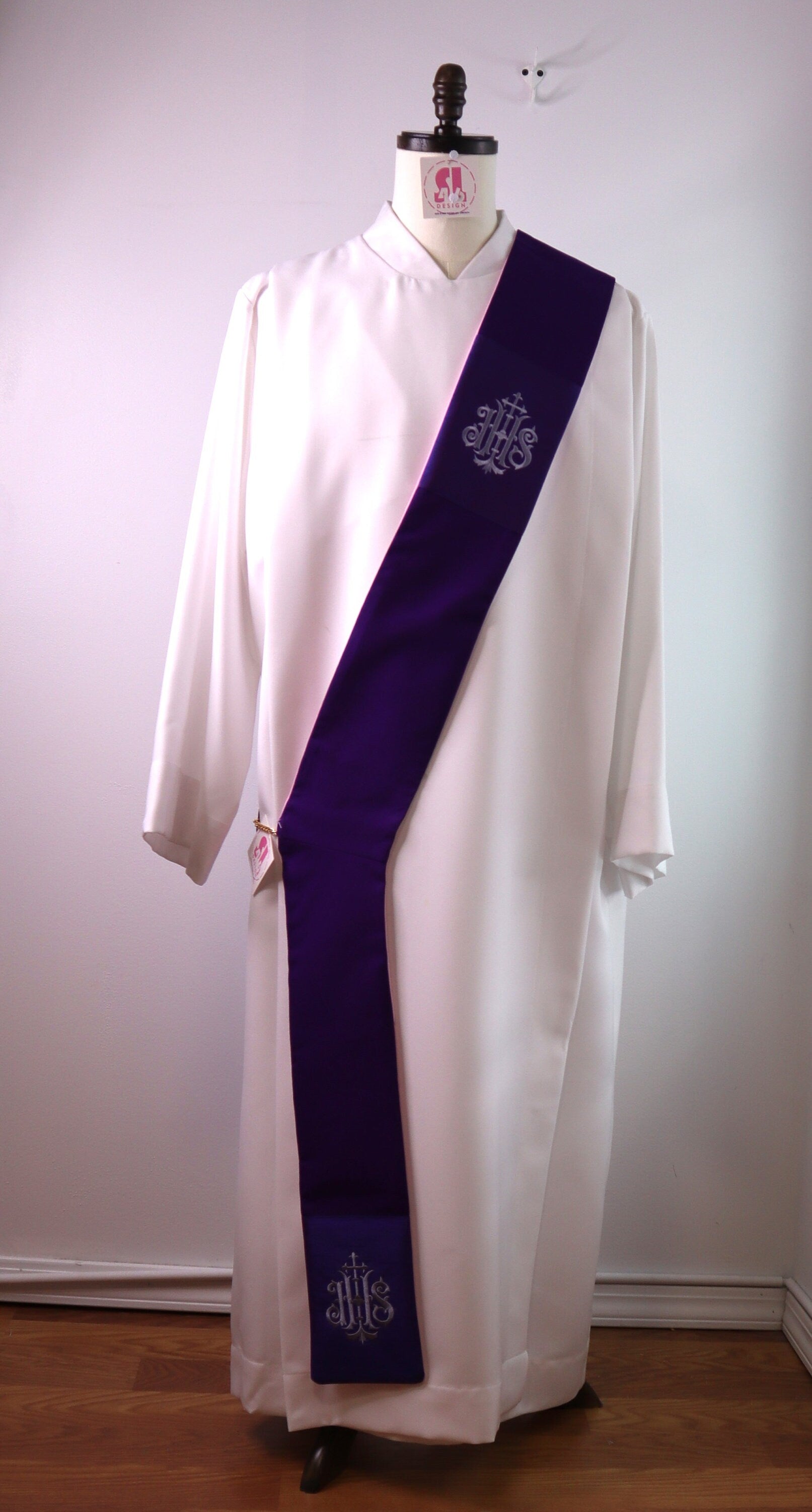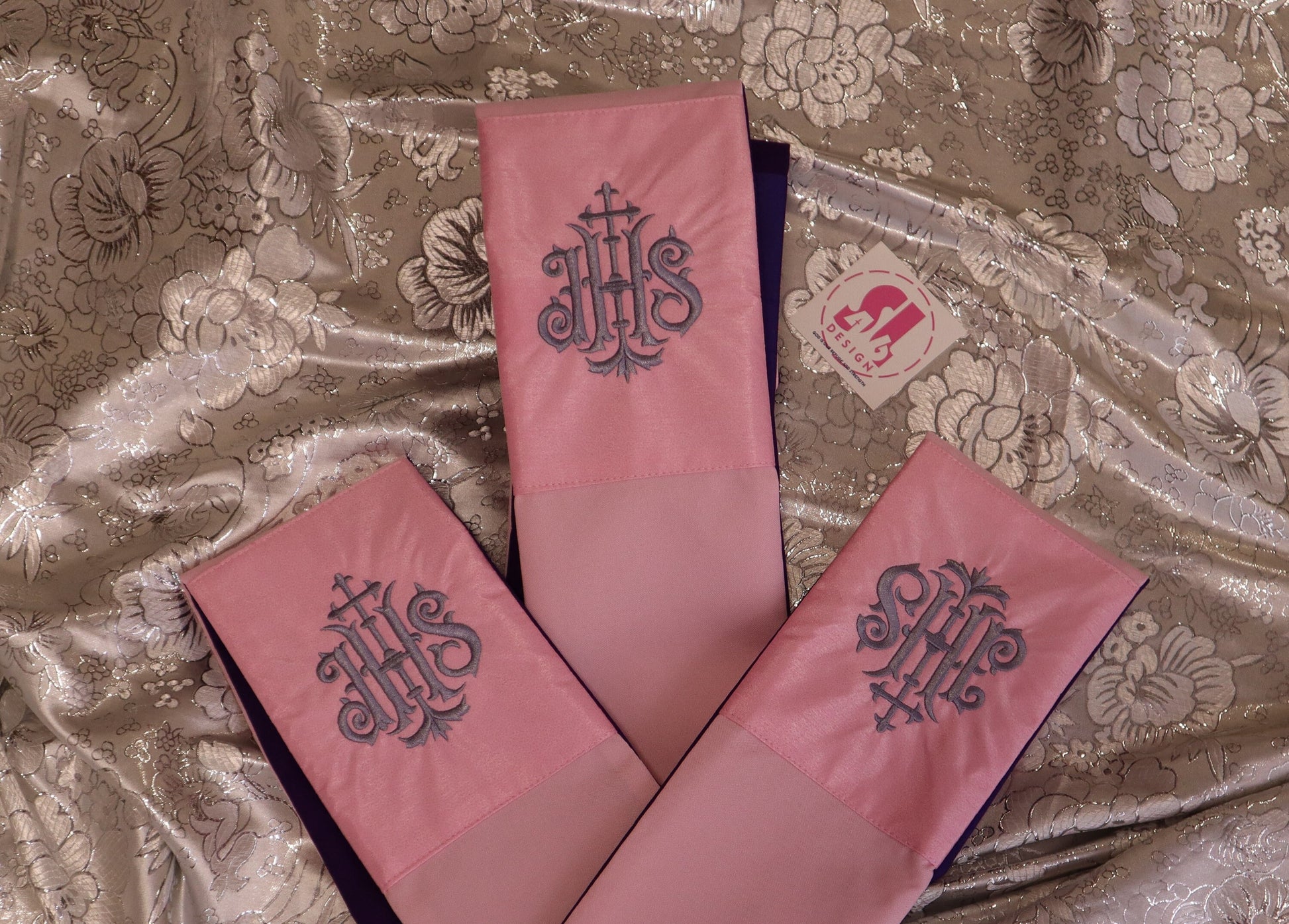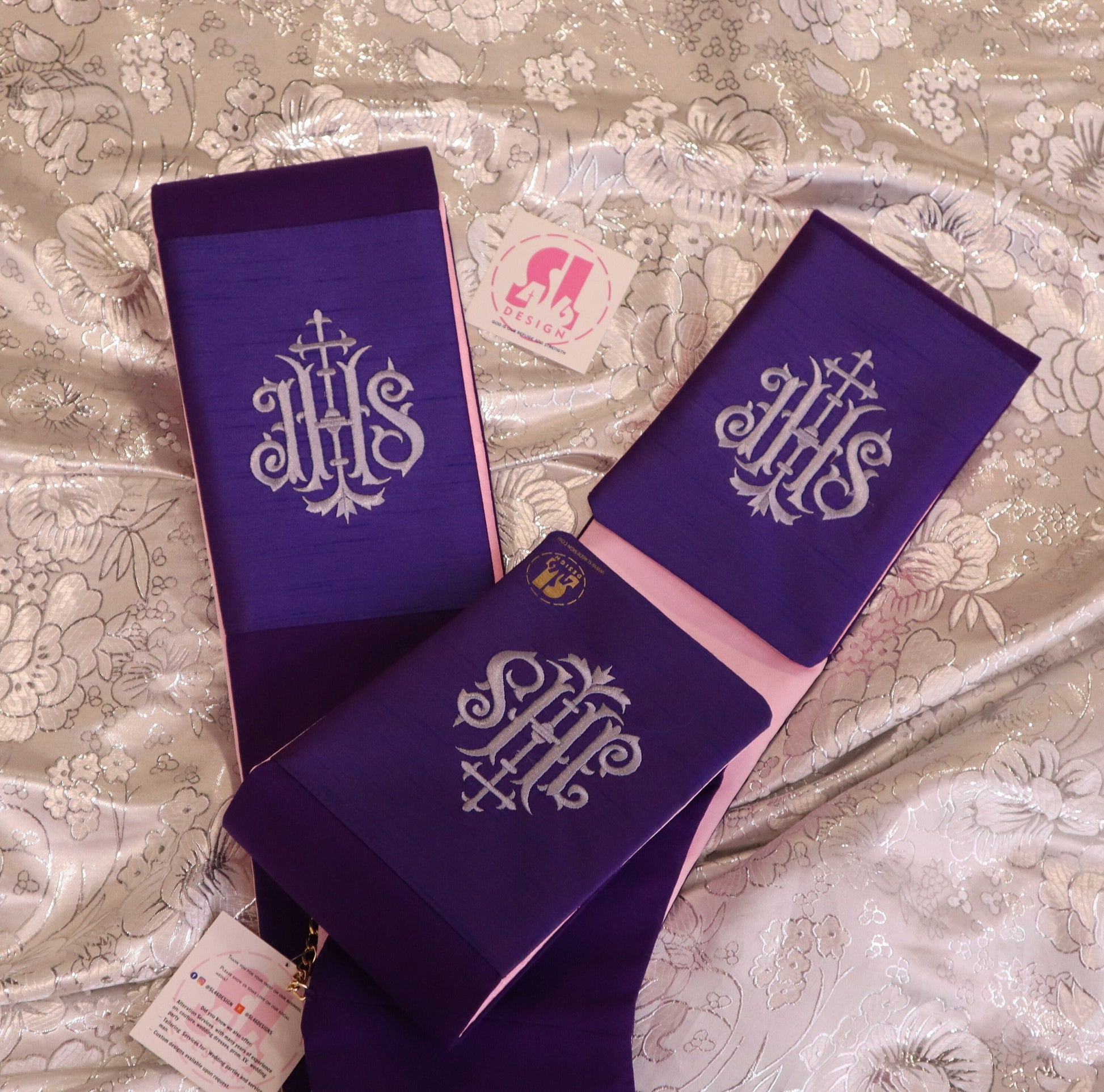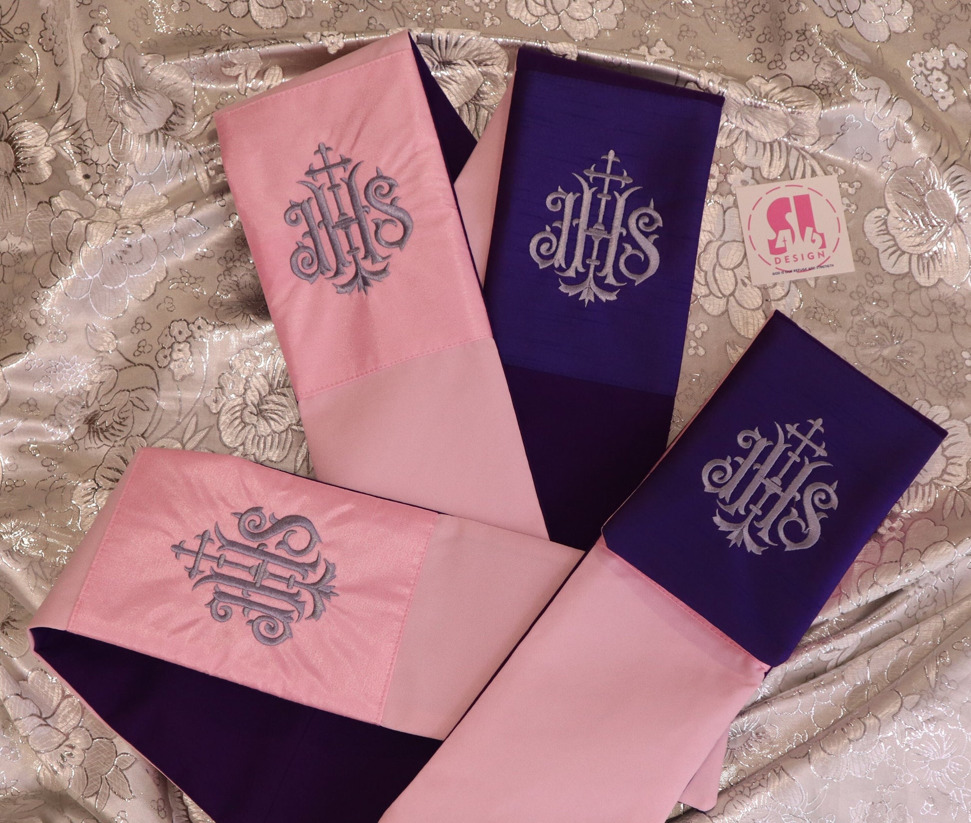 stole with double view in two colors that you can choose on the chest it has a Jerusalem cross and on the bottom front and back it has a small Jerusalem cross in total the stole has six embroideries