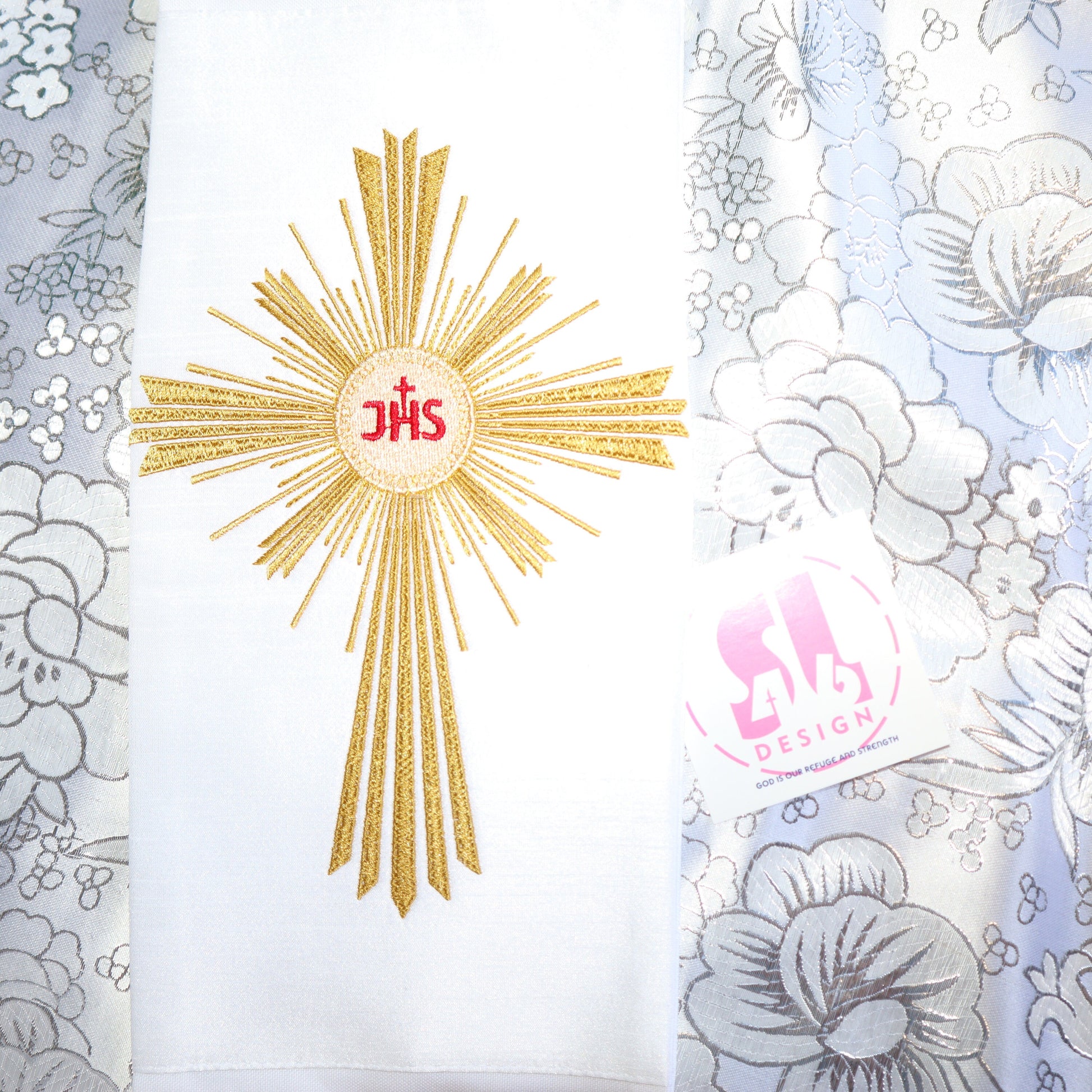 our stoles come with 3 embroidered designs that can be customized upon request