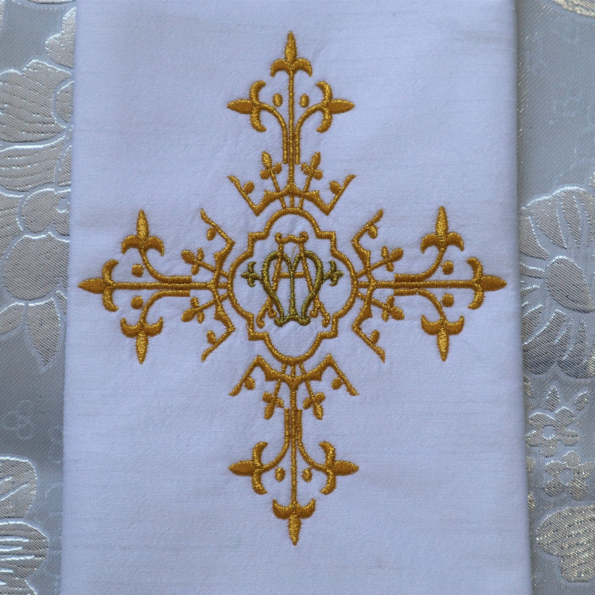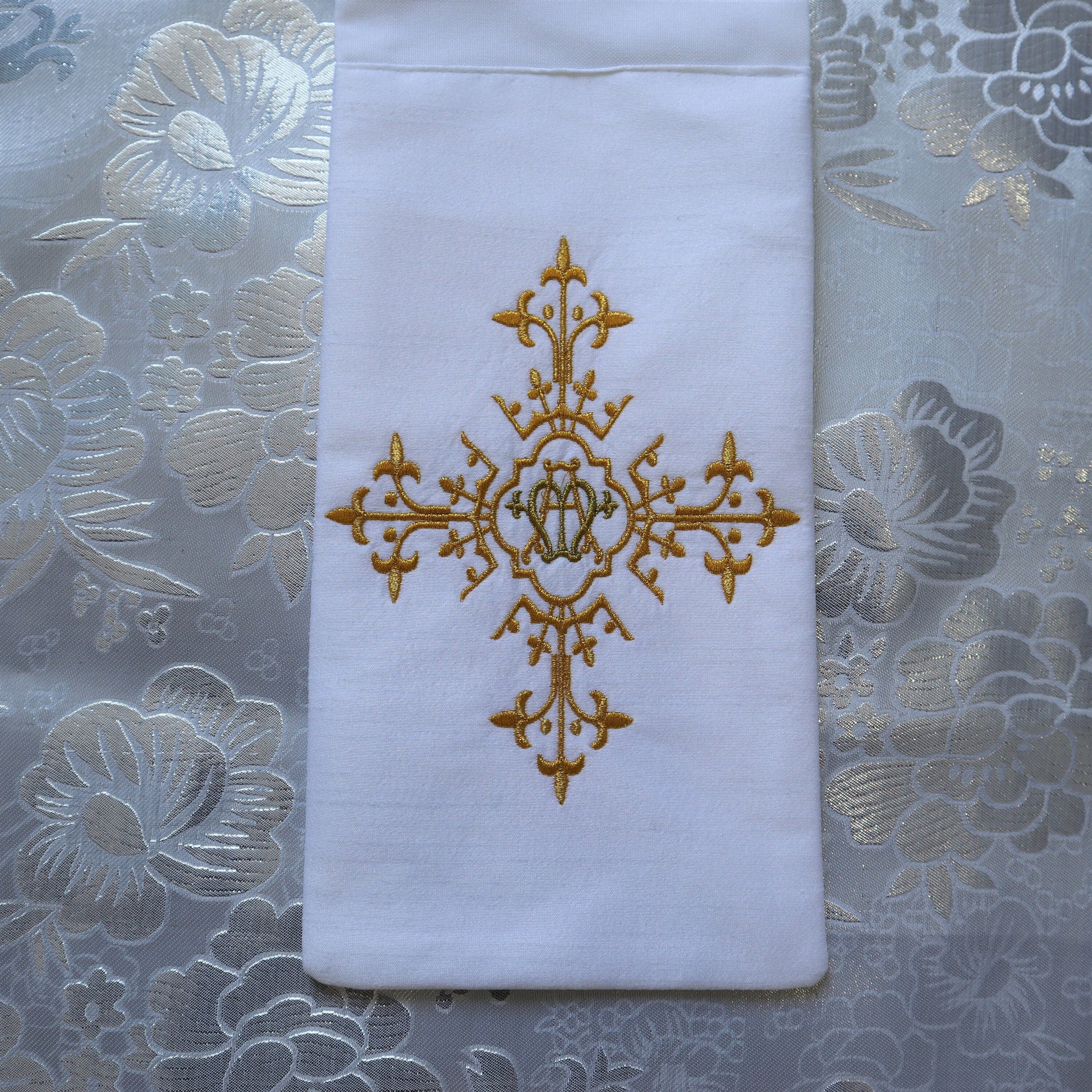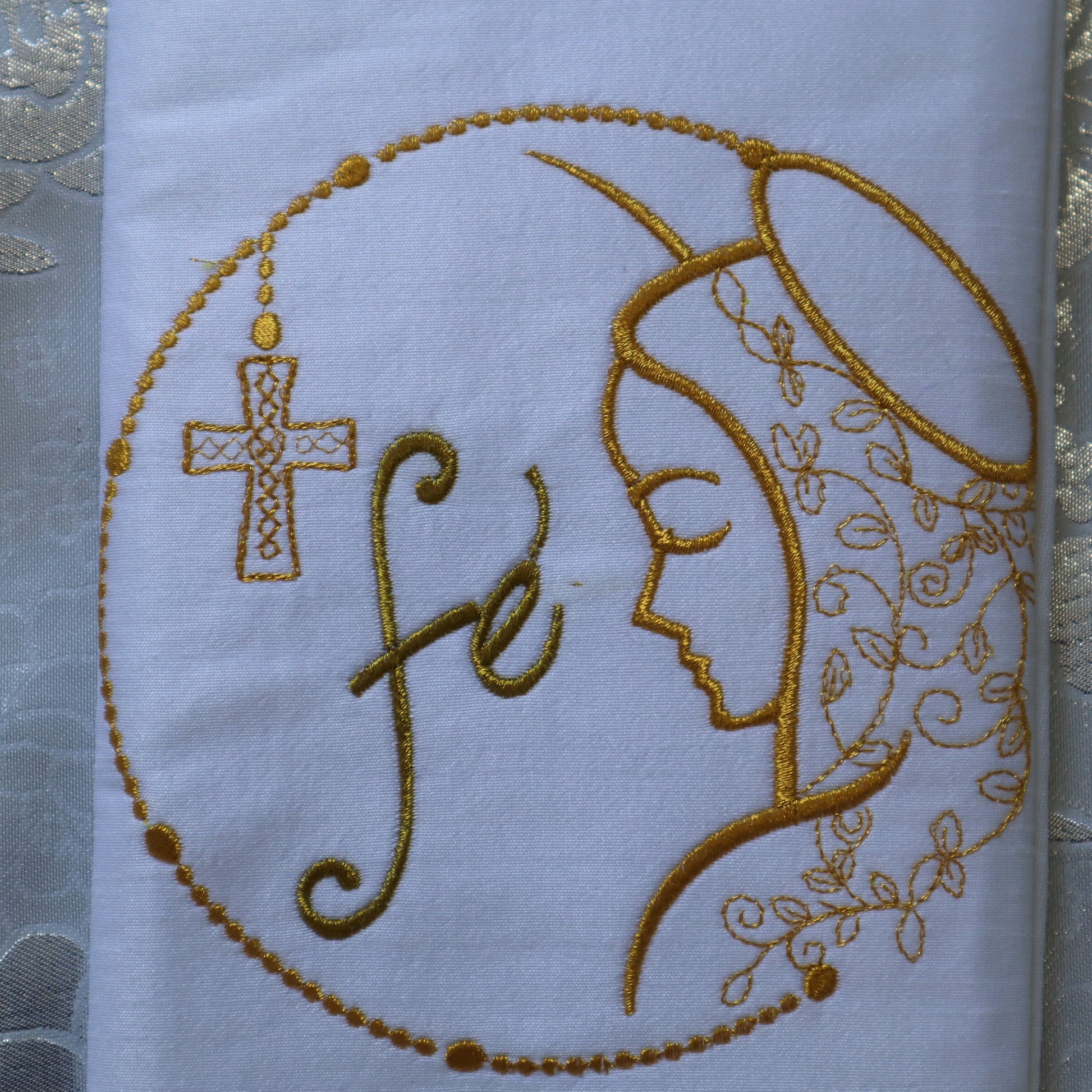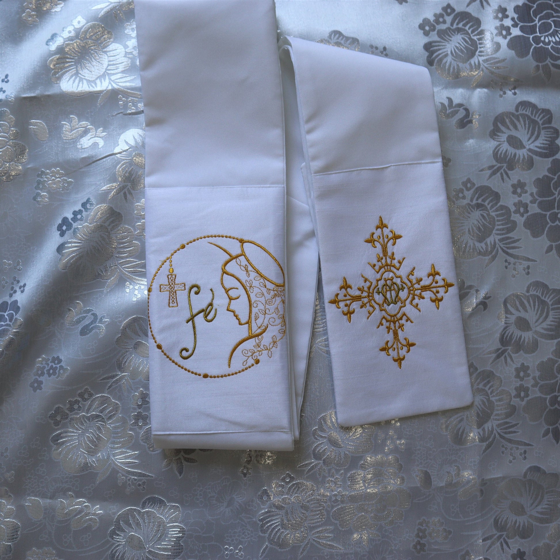 Materials: high quality cotton blend, the designs are embroidered in a accent fabric to give the piece an elegant touch, and the inside is a cotton blend that helps keep the stole in place.