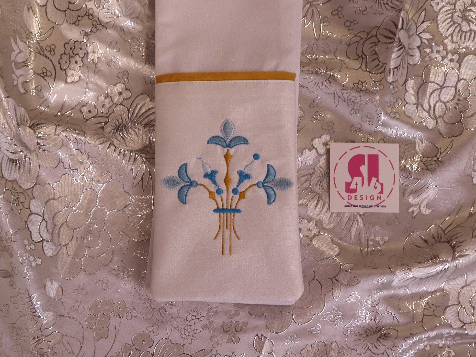 Materials: high quality cotton blend and designs are embroidered on a accent fabric to give the piece and elegant touch.