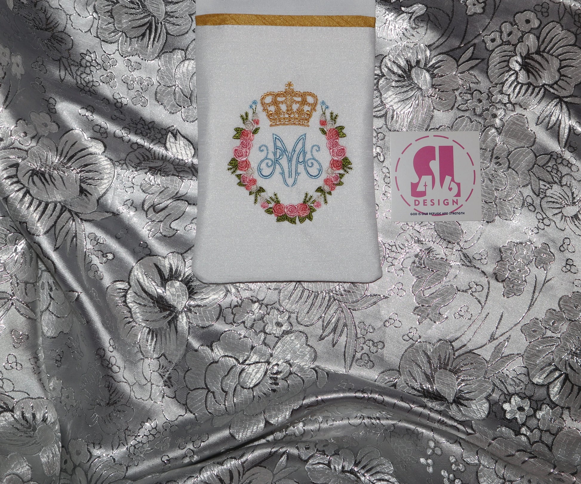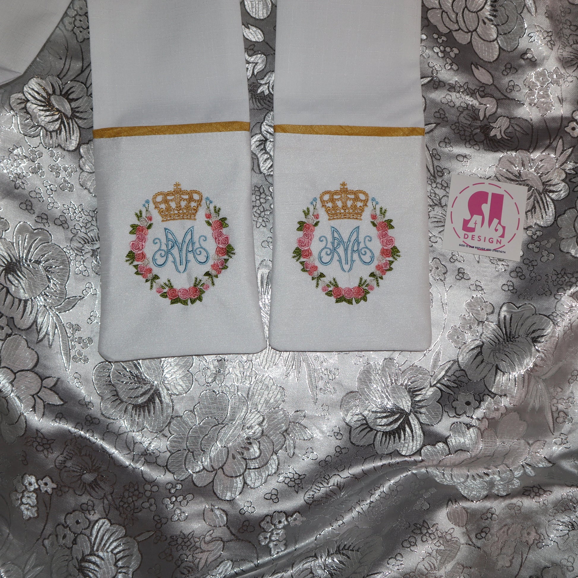 both embroidered designs are sitting on an accent brocade fabric for an elegant touch.