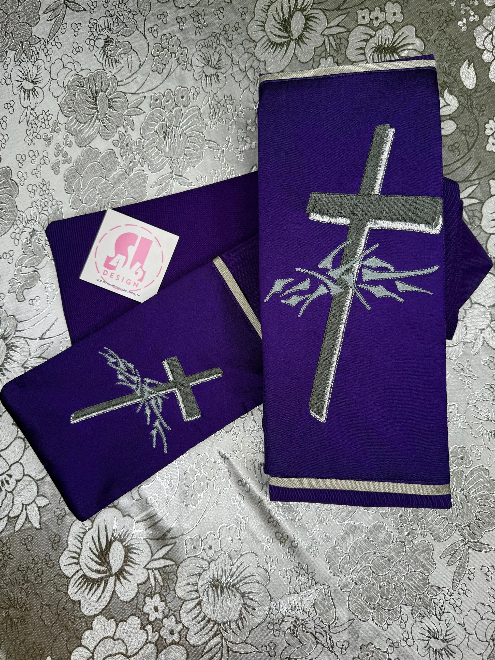 our stoles come with 3 embroidered designs that can be customized upon request.