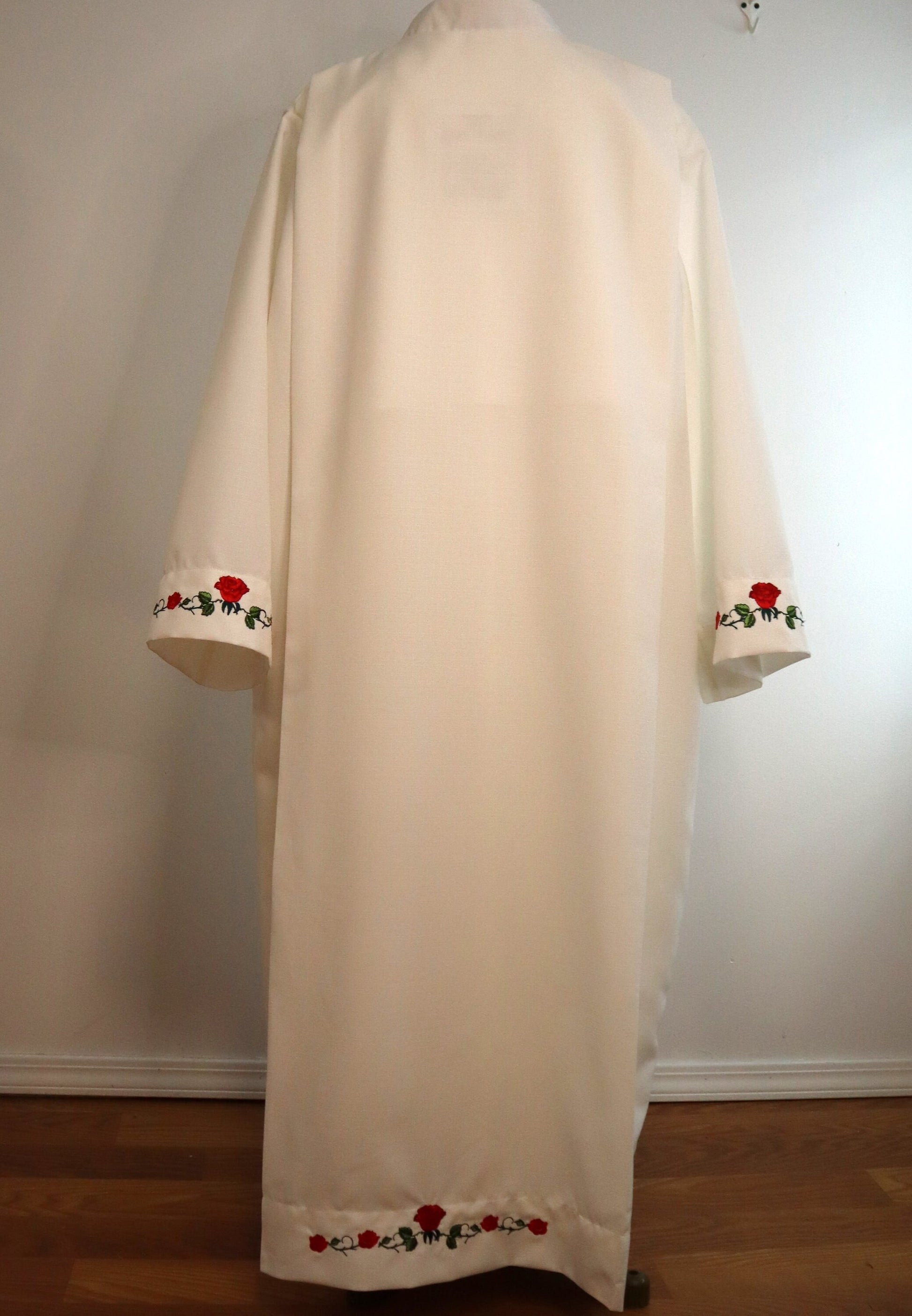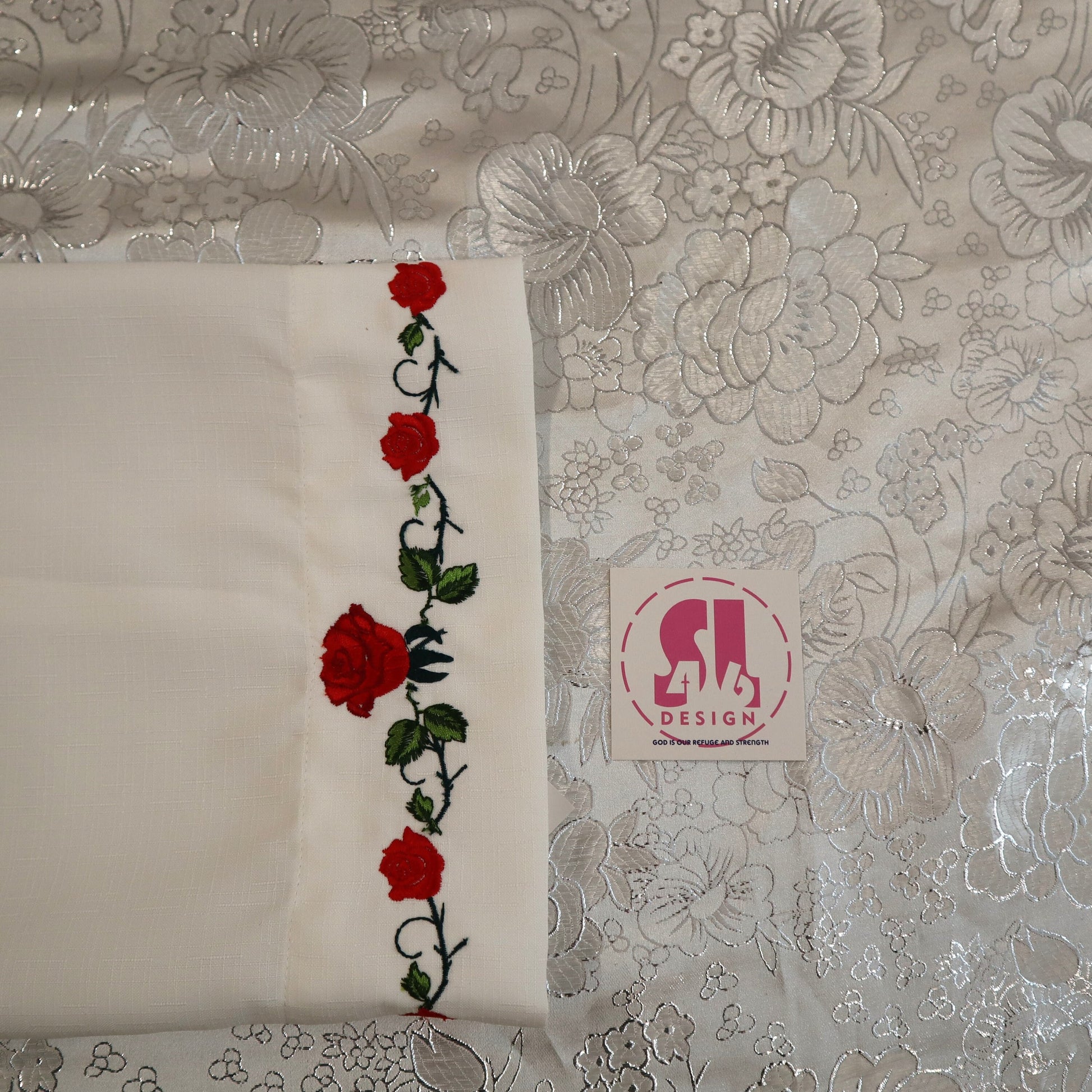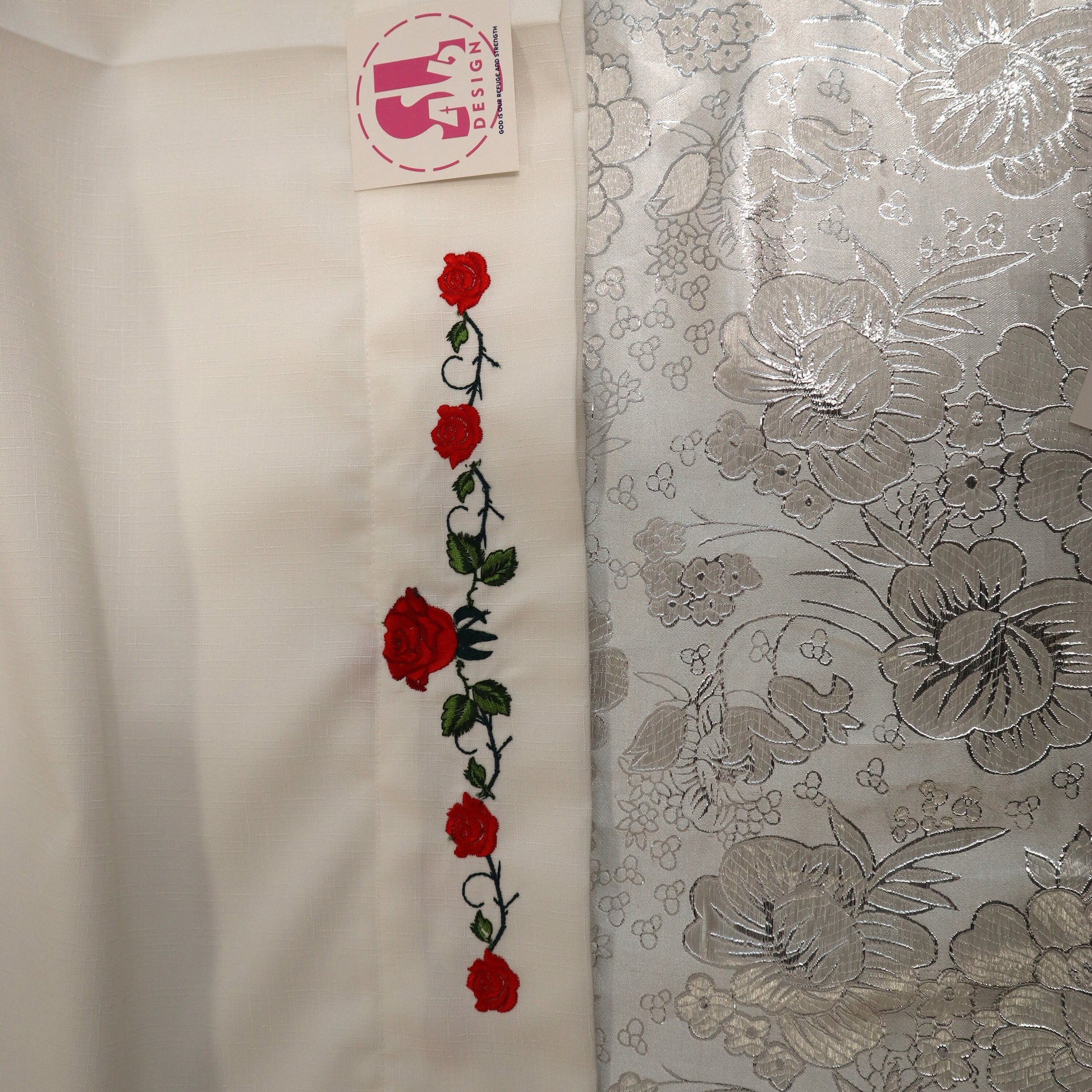 Custom made to fit. - there is embroidery designs on the front on the bottom front and back. And both sleeves. All embroidery are on white color to make them easy to wear all year long. But they can be changed if requested.