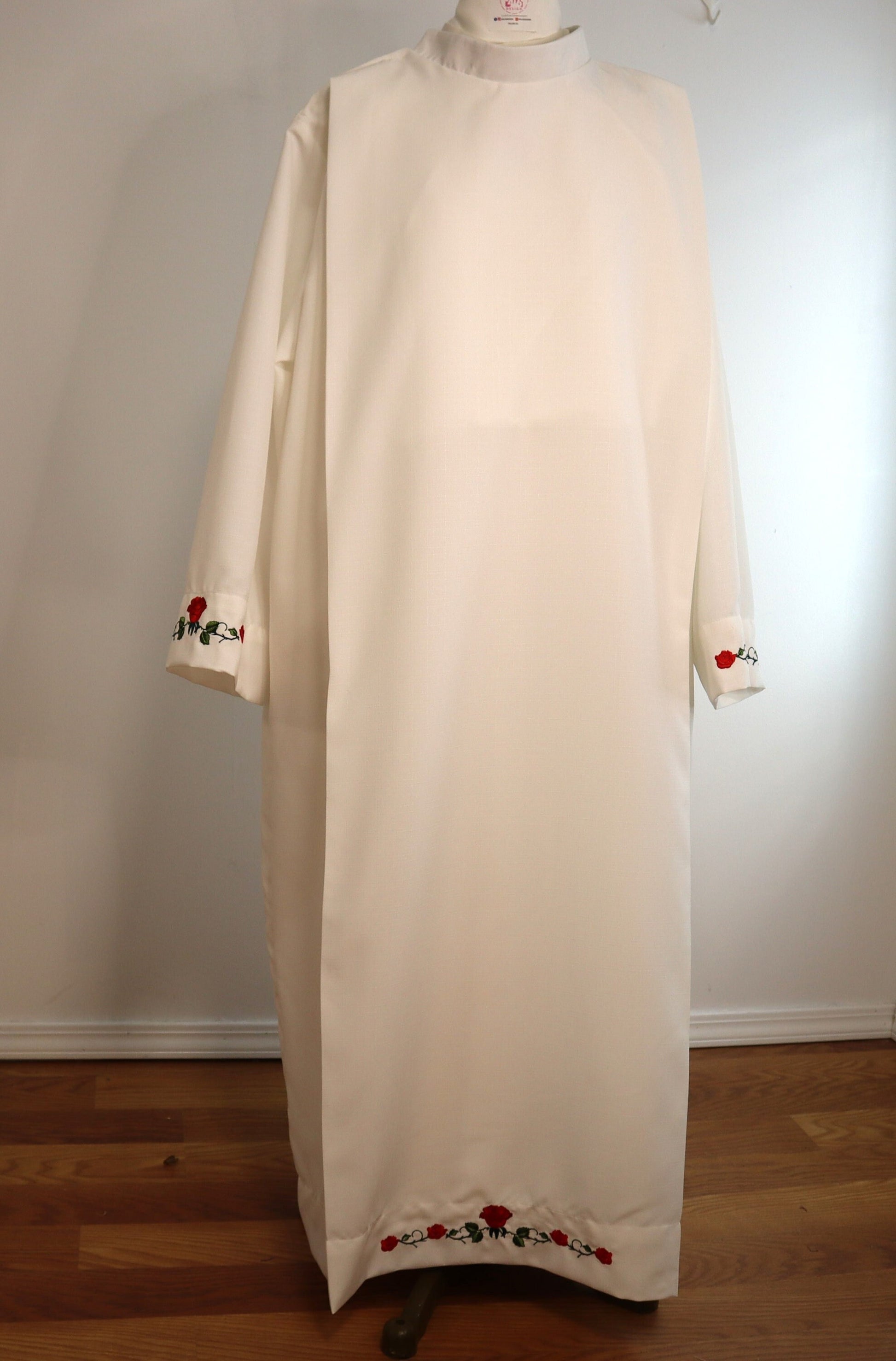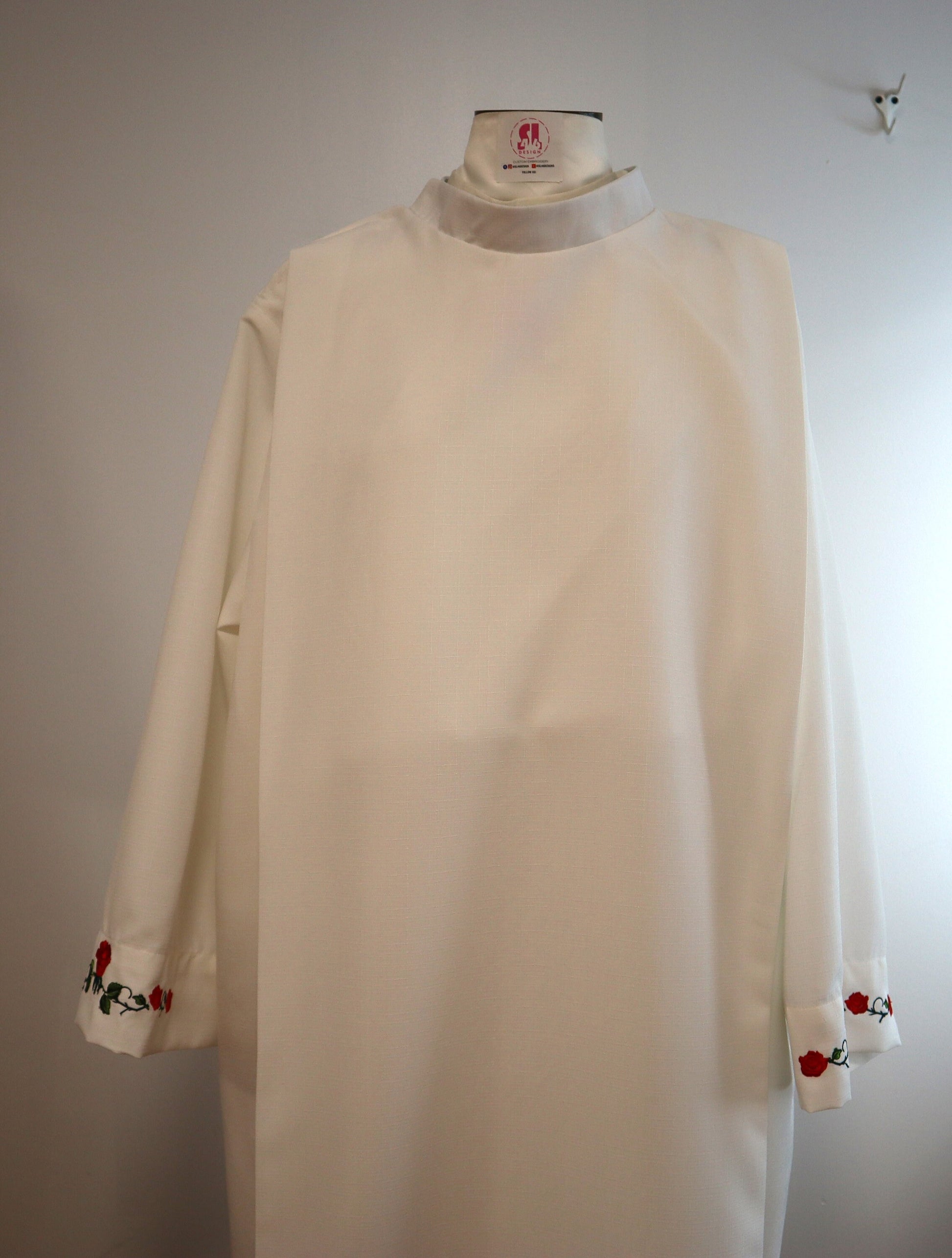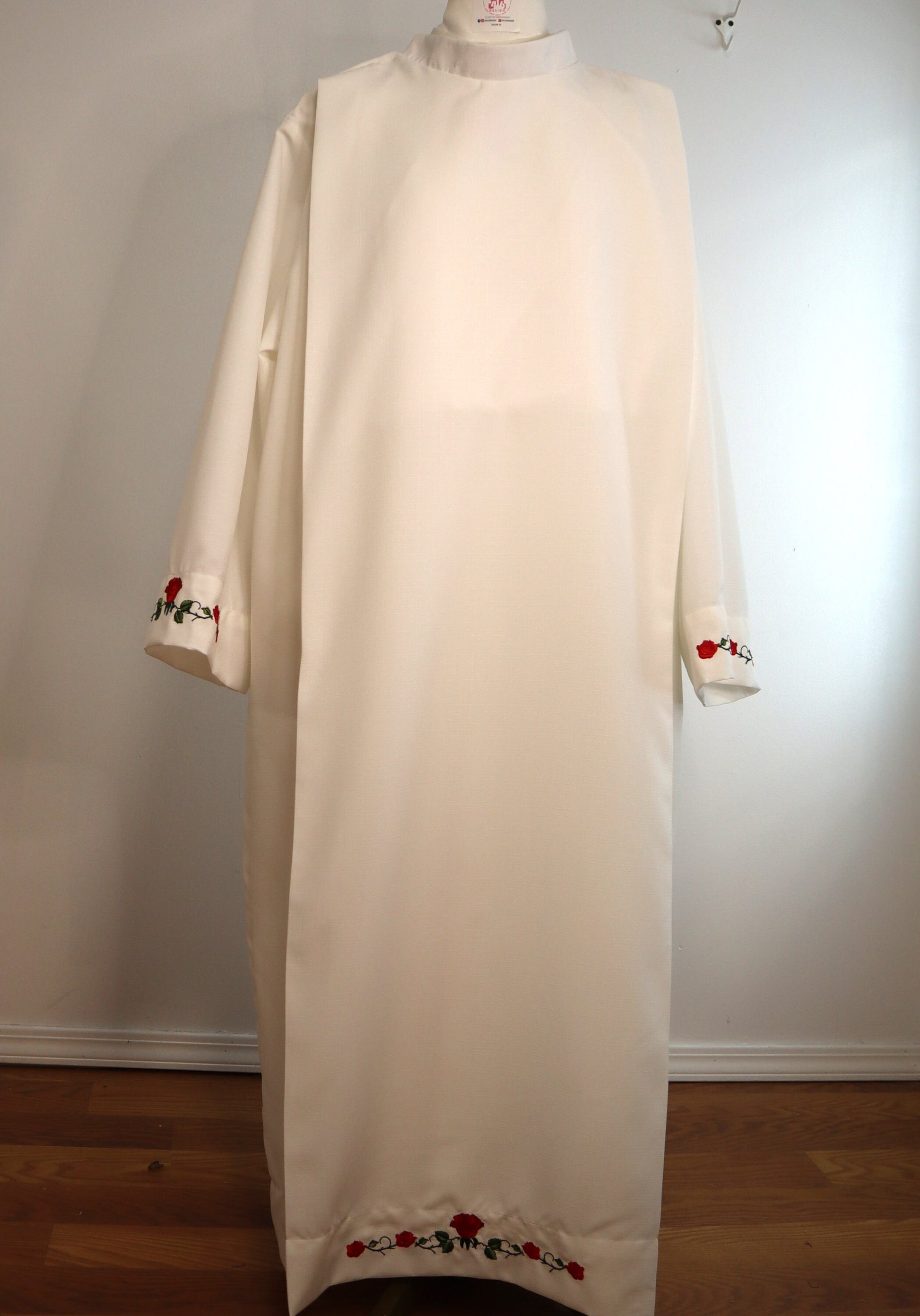 Custom made to fit. - there is embroidery designs on the front on the bottom front and back. And both sleeves. All embroidery are on white color to make them easy to wear all year long. But they can be changed if requested.