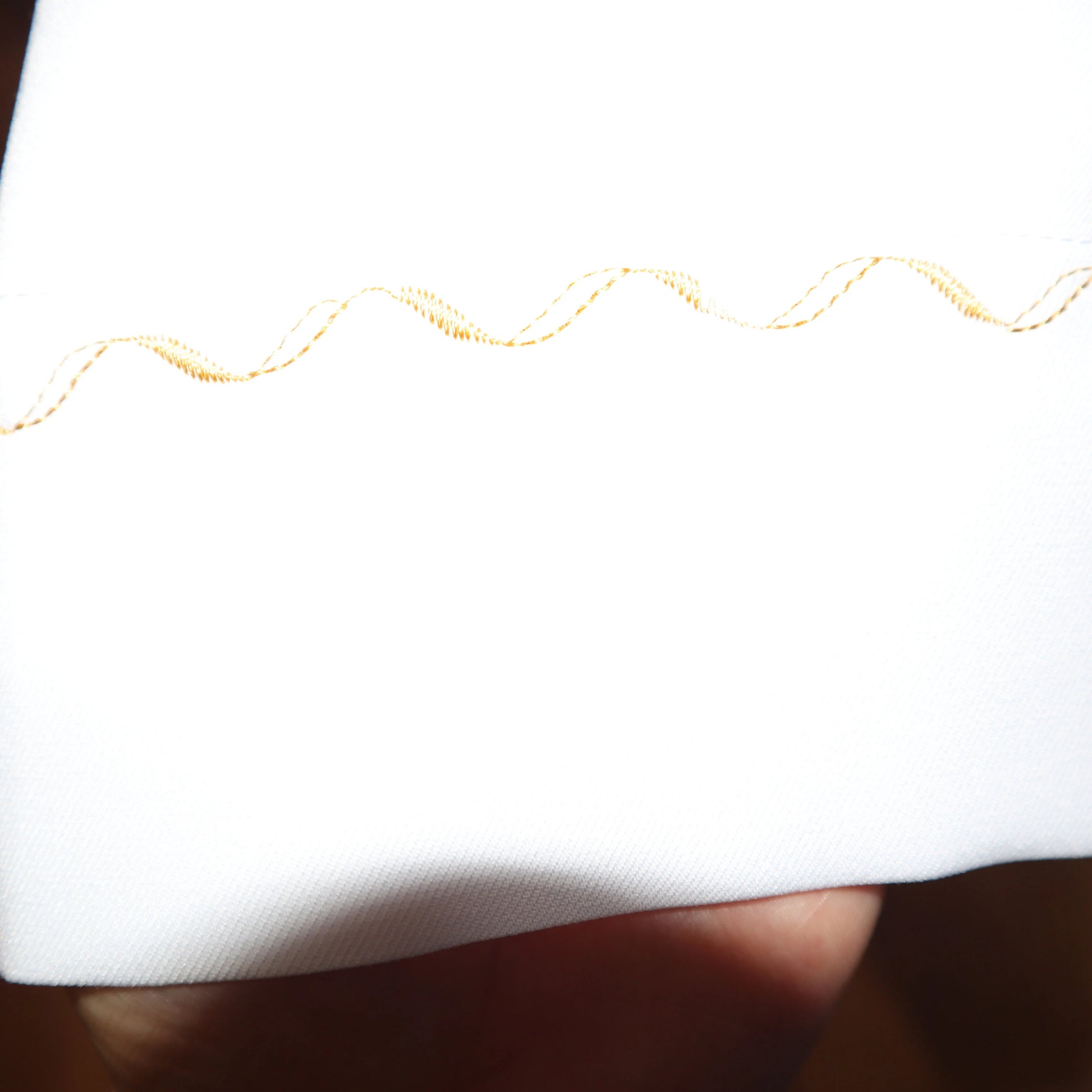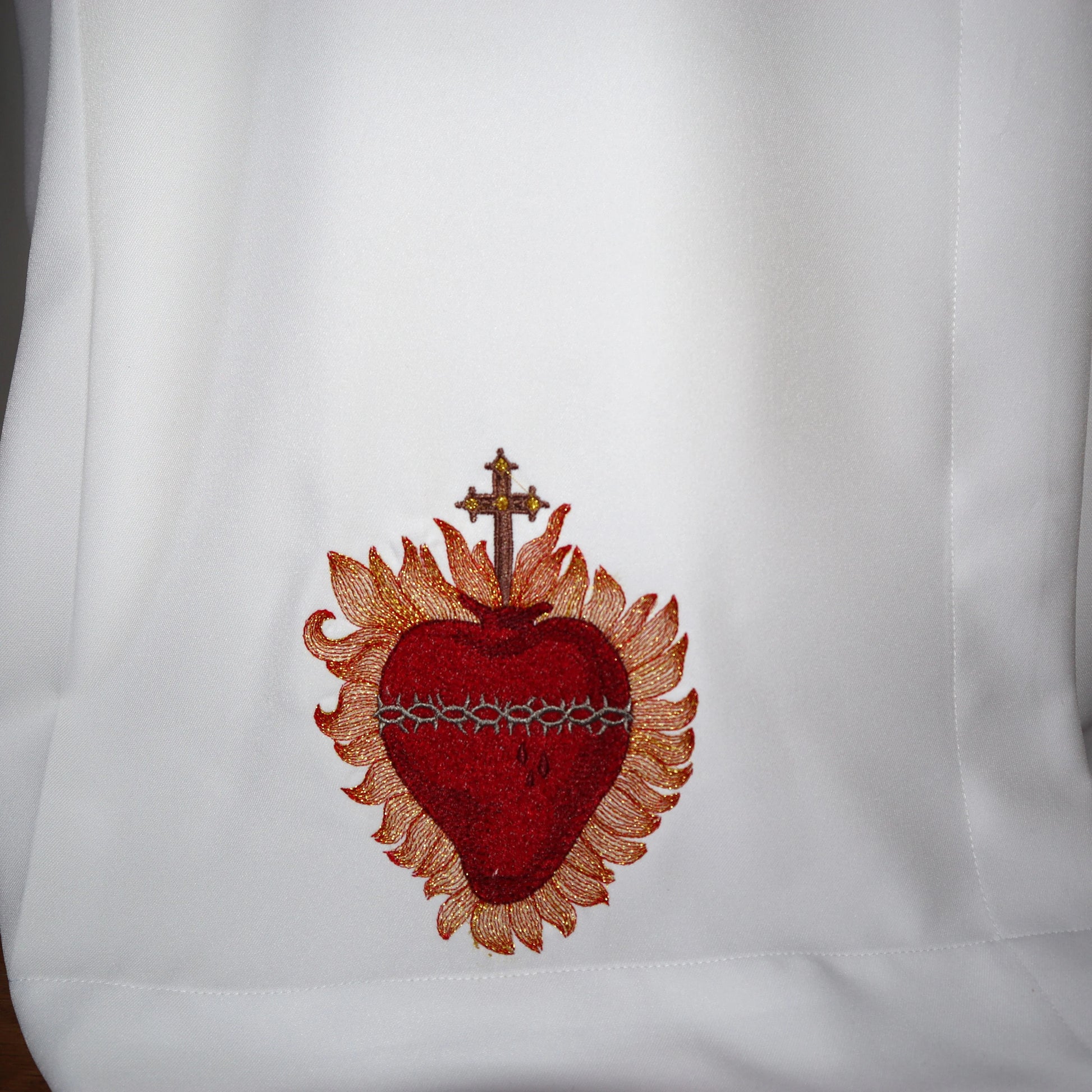 Custom made to fit. - there is embroidery designs on the front on the bottom front and back. And both sleeves. All embroidery are on white color to make them easy to wear all year long. But they can be changed if requested.