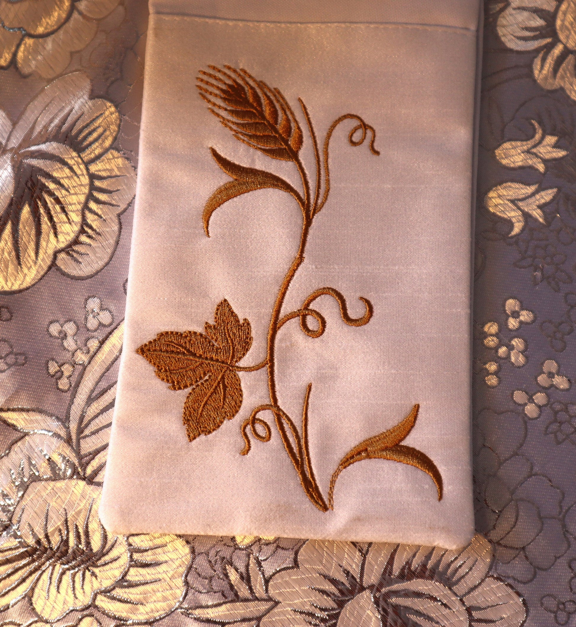 both embroidered designs are sitting on an accent brocade fabric for an elegant touch.