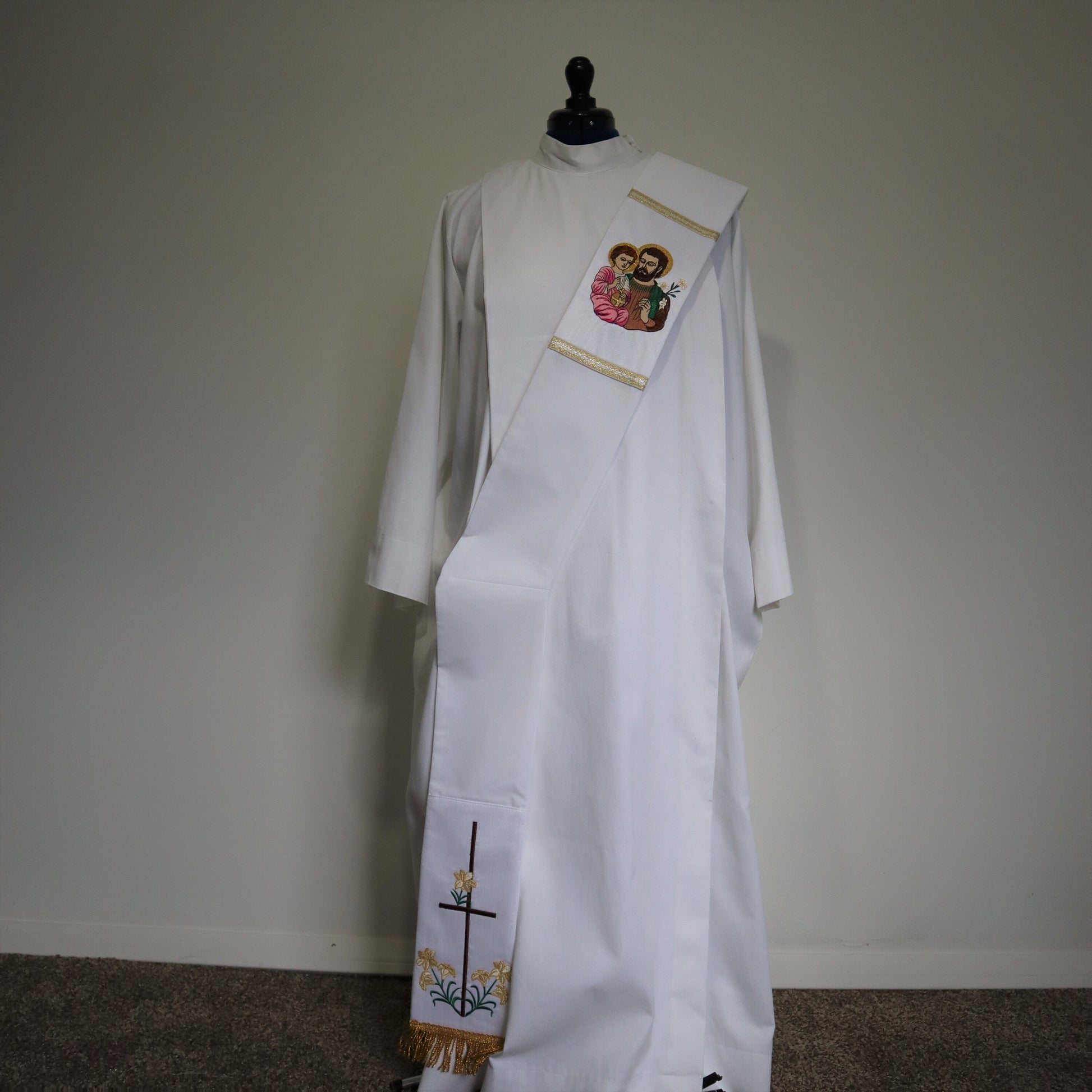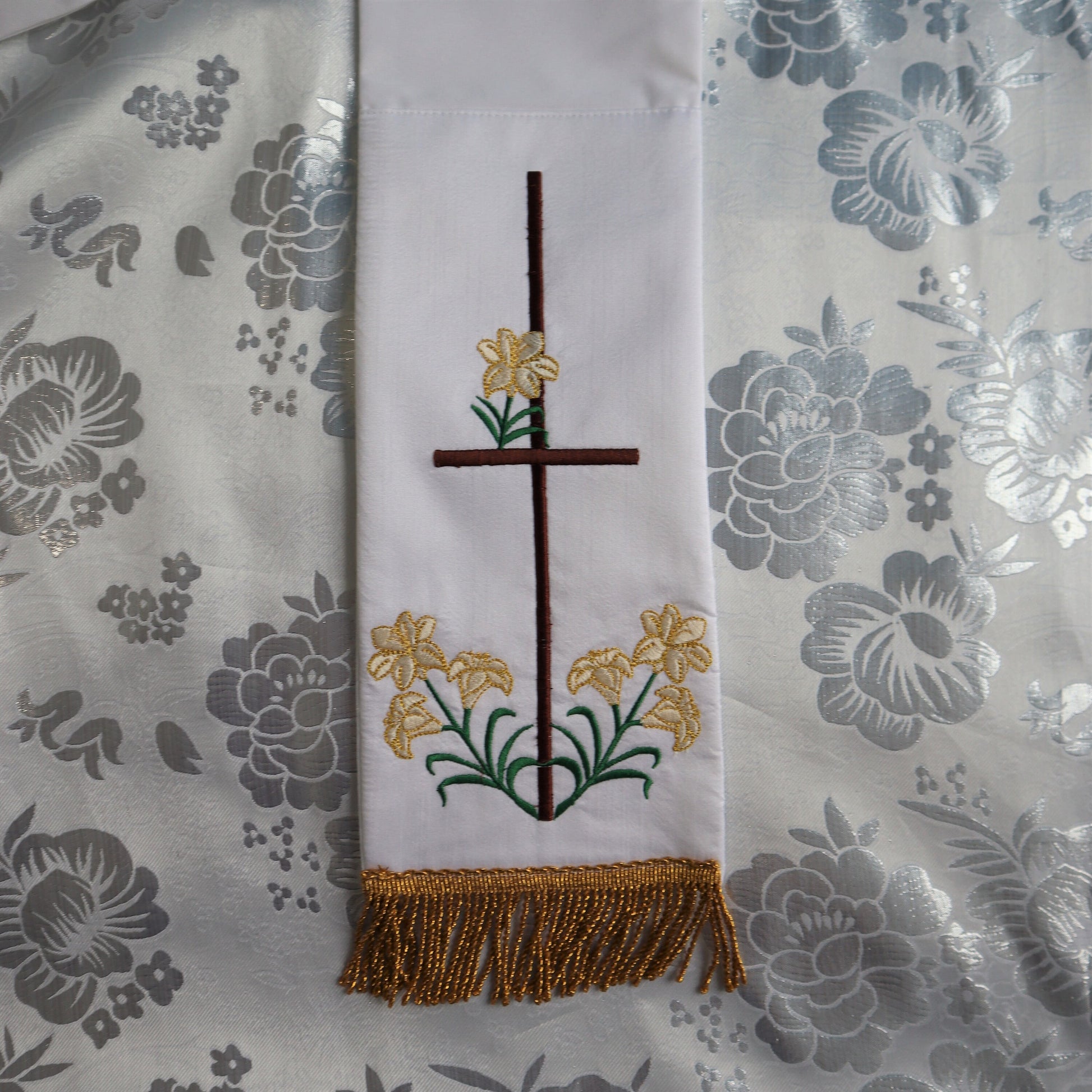 our stoles come with 3 embroidered designs that can be customized upon request.