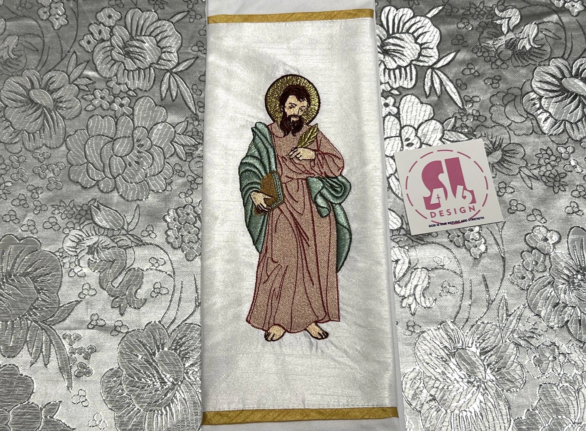 Materials: high quality cotton blend, the designs are embroidered in a accent fabric to give the piece an elegant touch, and the inside is a cotton blend that helps keep the stole in place.